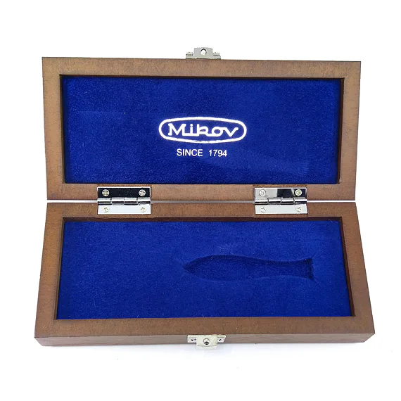 Dárková dřevěná krabička K130 je vhodá pro tradiční nože Rybička, které vyrábí naše společnost Mikov s.r.o. Mikulášovice. Modrá vnitřní výstelka je doplněna zdobením stříbrné barvy
