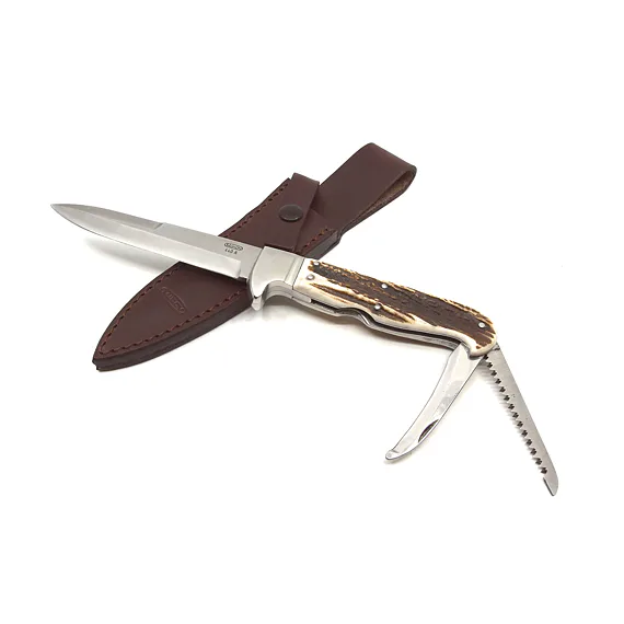 Držadlo dýky, které v sobě skrývá pilku a párák je vyrobeno z pravého jeleního parohu.