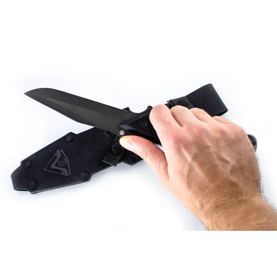 Rukojeť nože je soudkového typu s příložkami z materiálu G-10 černé barvy. Ergonomie je navržena tak, aby vyhovovala všem uchopům bez ohledu na velikost ruky.
