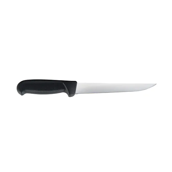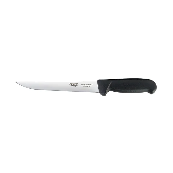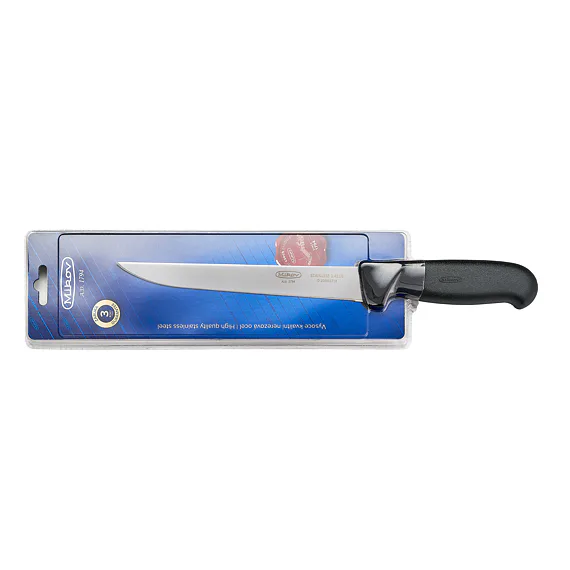 Kvalitní čepel s logem Mikov je vyrobena z kvalitní nerezové oceli 1.4116 (440A) o tvrdosti 55 – 58 HRc s vysokou řezivostí a otěruvzdorností osvědčenou pro výrobu řeznických a kuchyňských nožů. Je zasazena do plastové rukojeti, jejíž ergonomie umožňuje bezpečný a pohodlný úchop všemi prsty.