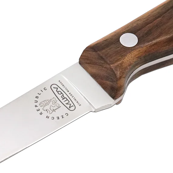Čepel s logem Mikov je vyrobena z kvalitní nerezové oceli 425 o tvrdosti 53-56 HRc, obsahující navíc legury Molybdenu a Vanadu, díky kterým má nůž vysokou řezivost a otěruvzdornost , tato ocel je osvědčená pro výrobu řeznických a kuchyňských nožů.